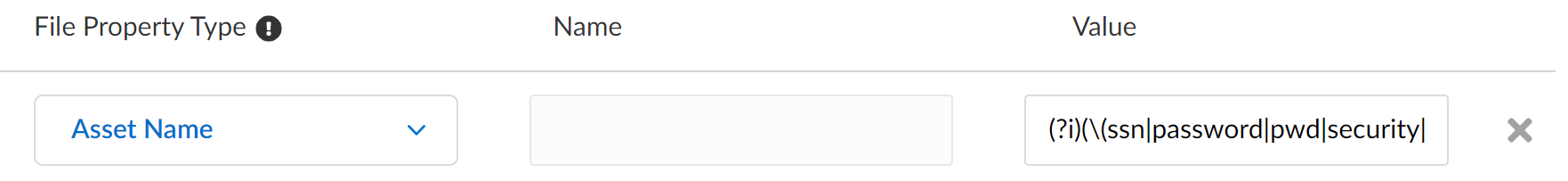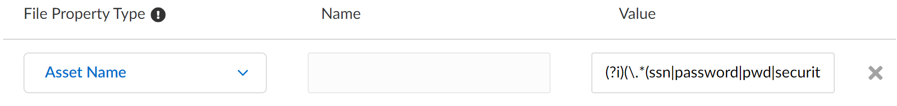 Only one Asset Name entry is supported per data pattern. However, you can add up to 100 Asset Name values to an Asset Name entry using ; as a separator. Asset Names entries support plaintext and fully formed regex expressions for the Asset Name value. Asset Name is designed to inspect for a full word match. If a partial match is required, then the inclusion of a wild card character in the regular expression is required.