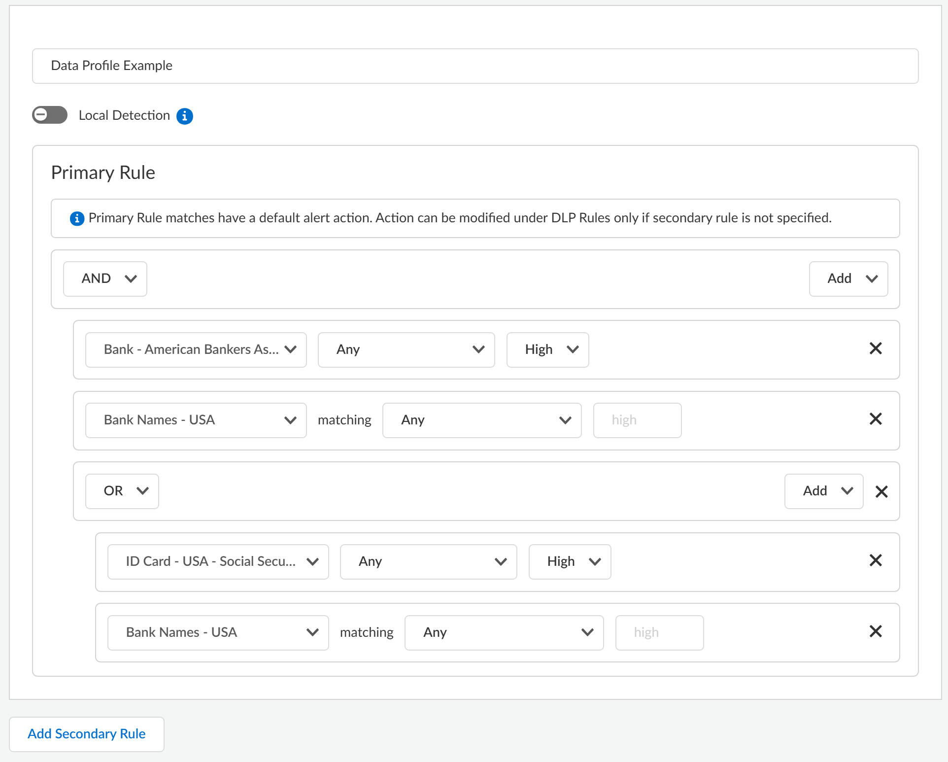 (Prisma Browser) Prisma Browser doesn't support Secondary Rules for both cloud-assisted and local detection data profiles. Prisma Browser ignores all Secondary Rules.
