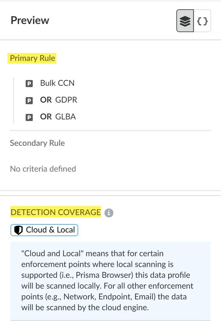 A data profile with Cloud & Local detection coverage includes only the detection methods that are compatible with local Prisma Browser detection.