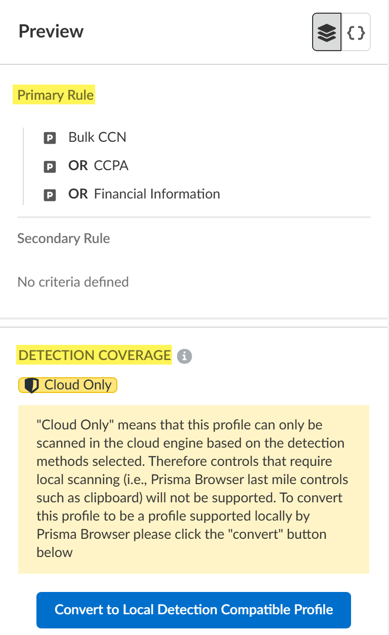 (Prisma Browser) If you copied a Cloud Only data profile, click Convert to Local Supported Profile in the Preview panel to remove all match criteria not supported by local Prisma Browser detection. This converts the data profile into a data profile with Cloud & Local detection coverage.