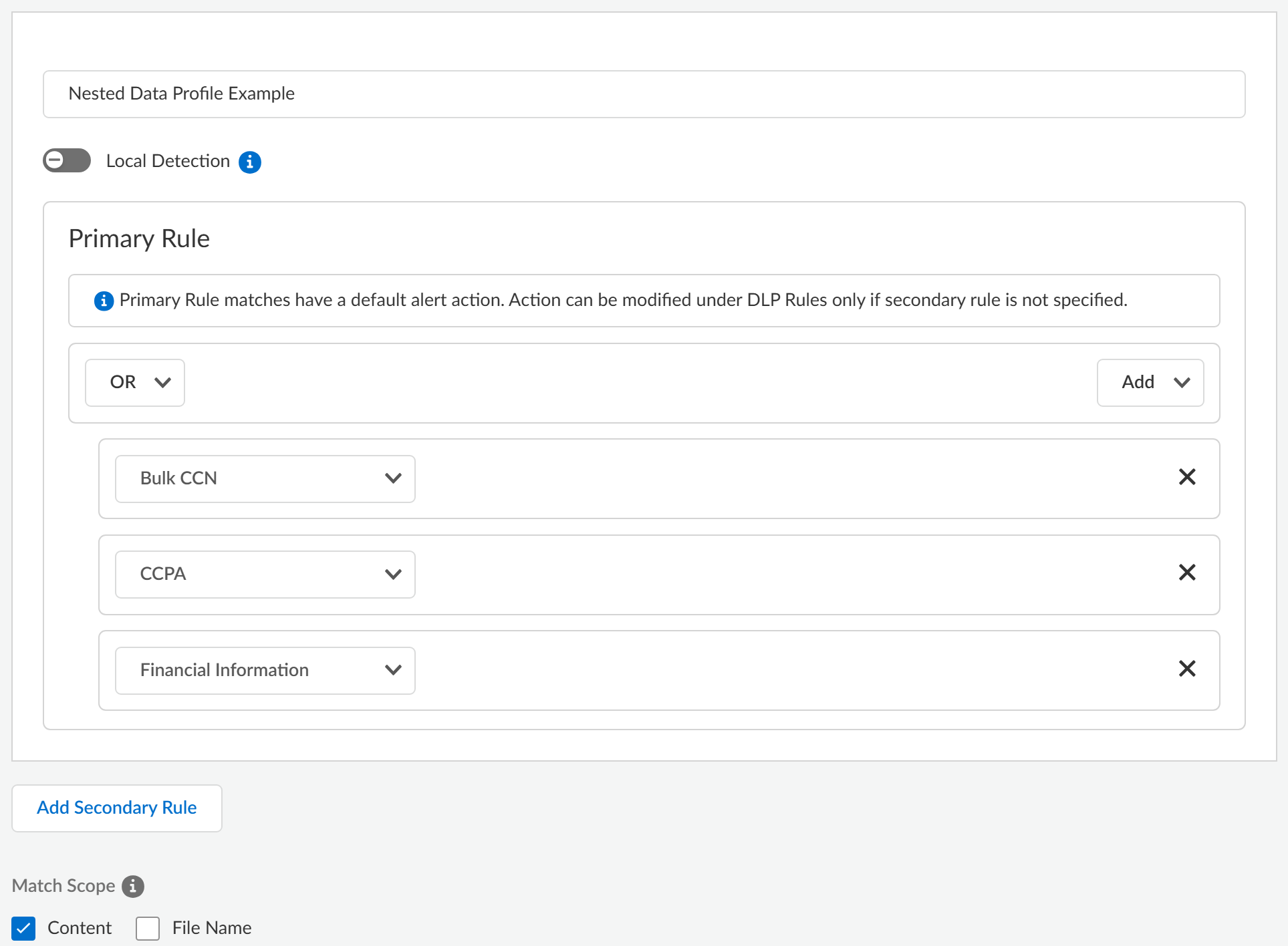 - Enterprise DLP supports adding a data profiles that have only a Primary Rule configured. Enterprise DLP does not support adding data profiles that include both Primary and Secondary Rules to a nested data profile.