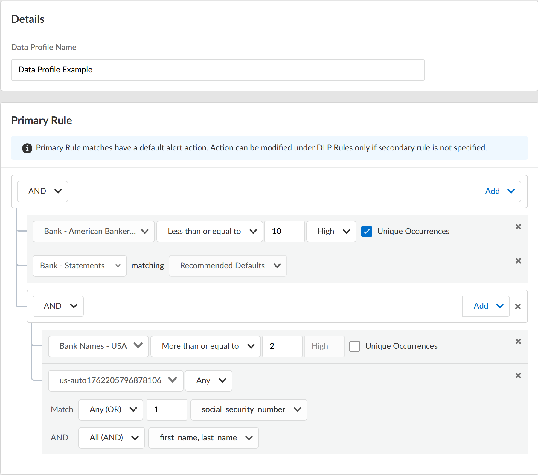Select AddData Profile to add a granular or nested data profile to enhance your Enterprise DLP detection capabilities by enabling you to apply differentiated inline content inspection requirements and response actions within the same Security policy rule.