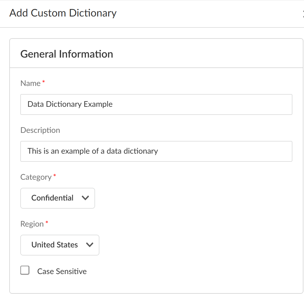 - If you want to upload a data dictionary to a region-specific storage bucket, allow the region-specific Public API URL and Storage Bucket on your network.Log in to Strata Cloud Manager.Select ConfigurationData Loss PreventionDetection MethodsData Dictionary and Add Custom Dictionary.Enter a descriptive Name for the data dictionary.The data dictionary must have a unique name. The upload fails if a data dictionary with an identical name already exits.Special characters are not supported.(Optional) Enter a Description for the data dictionary.Enterprise DLP doesn't support special characters in the data dictionary description.Select the data dictionary Category.Enterprise DLP uses the data dictionary category to group together similar types of data dictionaries for administrative purposes.You can specify one of the following predefined categories—Academia, Confidential, Employment, Financial, Government, Healthcare, Legal, Marketing, or Source Code.Select the Region where you want to upload and store your data dictionary.Specify whether keywords are Case Sensitive.This settings instructs Enterprise DLP to treat uppercase and lowercase letters for all keywords in the data dictionary as distinct (case sensitive) if enabled or as equivalent (case insensitive) if disabled.