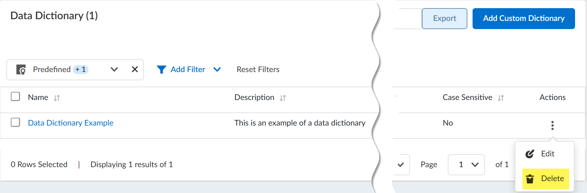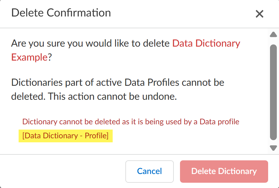 You are prompted to confirm you want to delete the data dictionary. Click Delete Dictionary to confirm permanently deleting the data dictionary from Enterprise DLP.You can't delete a data dictionary if it's currently included in a data profile. Enterprise DLP displays the data profiles currently referencing the data dictionary you want to delete.
