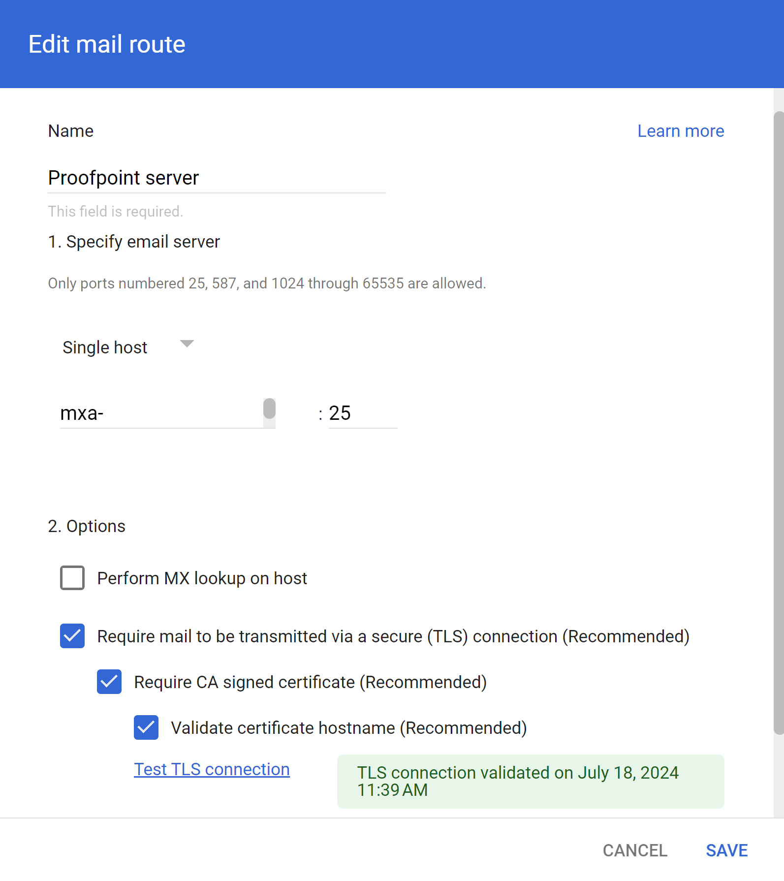 Log in to the Google Admin Console.In the Dashboard, select AppsGoogle WorkspaceGmailHosts and Add Route.Configure your Proofpoint server.- Enter a descriptive Name for the Proofpoint server route.In Specify email server, verify Single host is selected.Only a single host Proofpoint server is supported.Enter the hostname and port for the Proofpoint server.For the Options, verify the following settings are enabled.