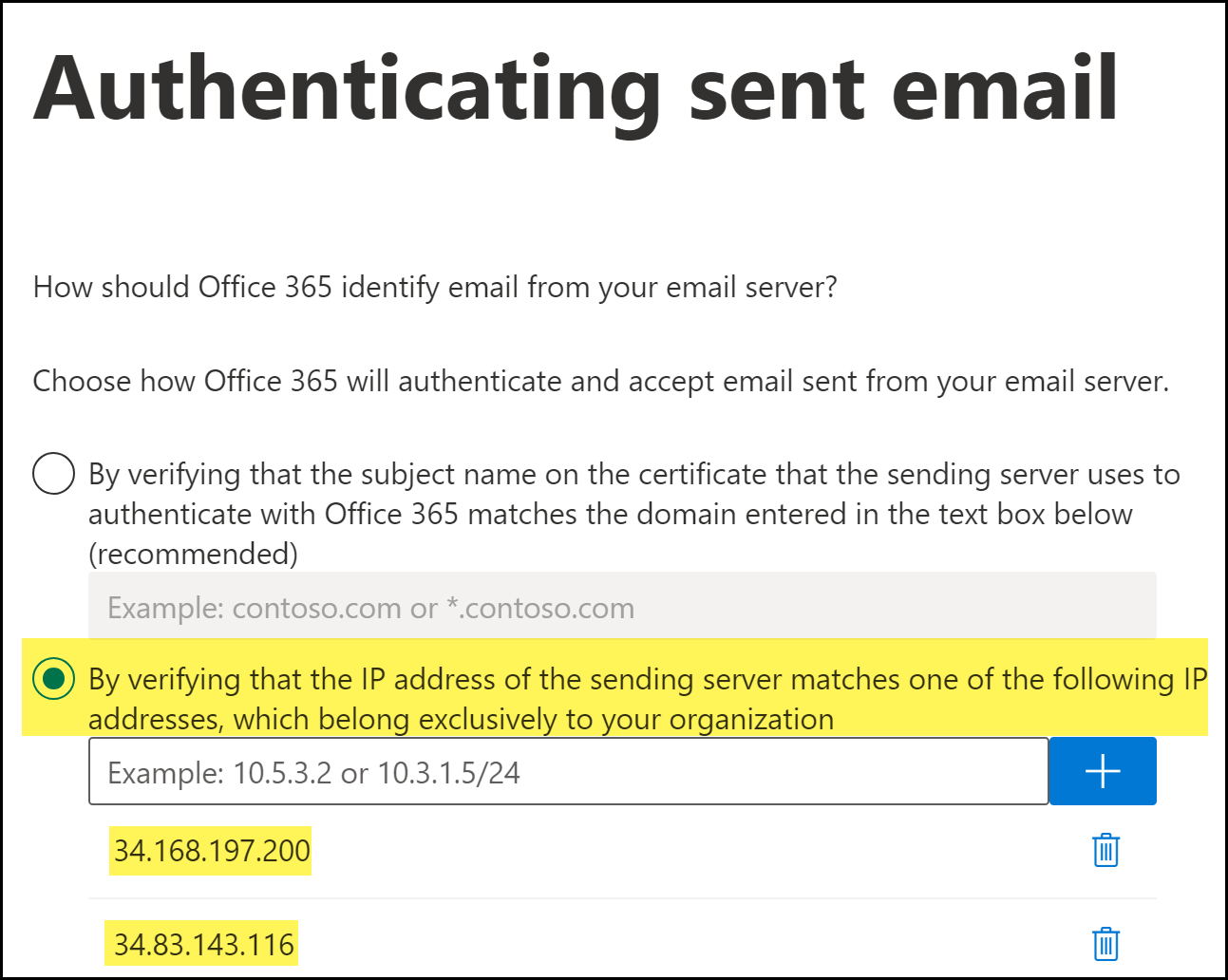 1. Select By verifying that the IP address of the sending server matches one of the following IP address, which belong to your partner organization.