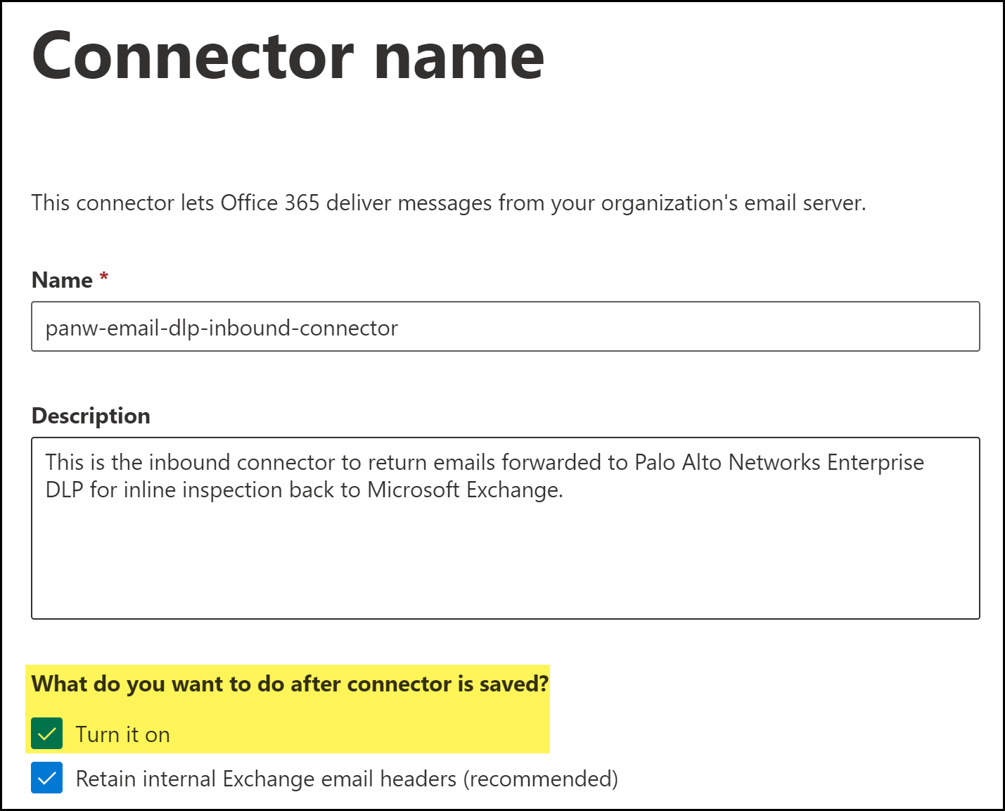Create an inbound Microsoft Exchange Online Connector to return emails forwarded to Enterprise Data Loss Prevention (E-DLP) for inline inspection back to Microsoft Exchange.