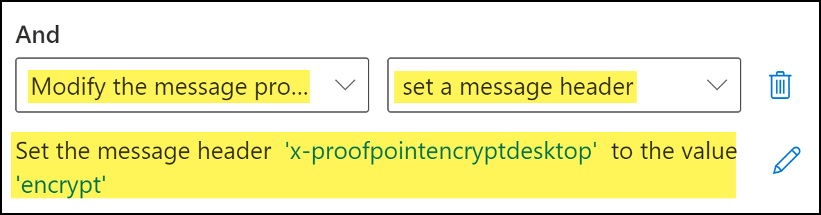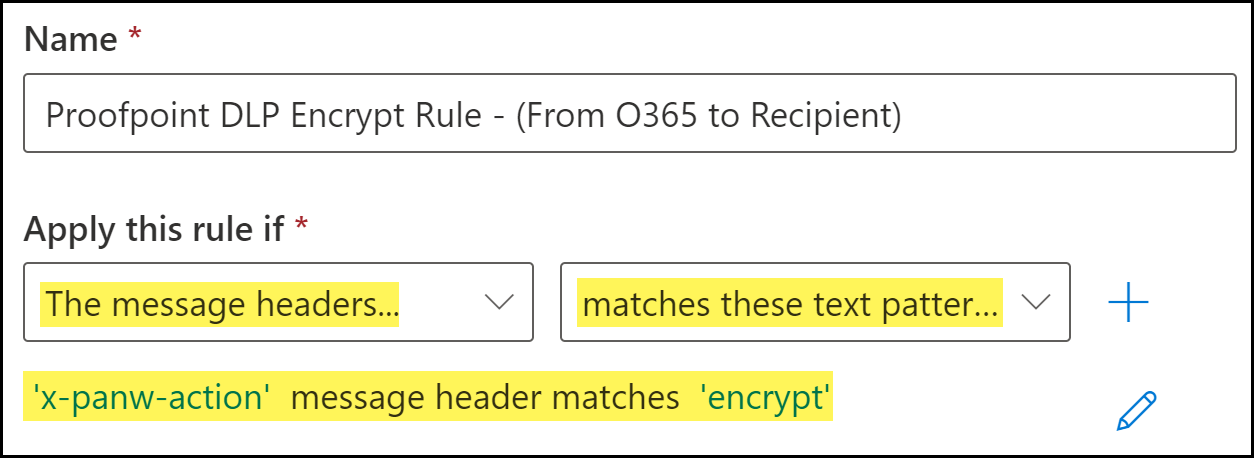 Configure the encrypt transport rule conditions.- Enter a Name for the Proofpoint encrypt transport rule.Add the encrypt email message header.The encrypt header is added by the DLP cloud service when an email contains sensitive information that should be encrypted.
