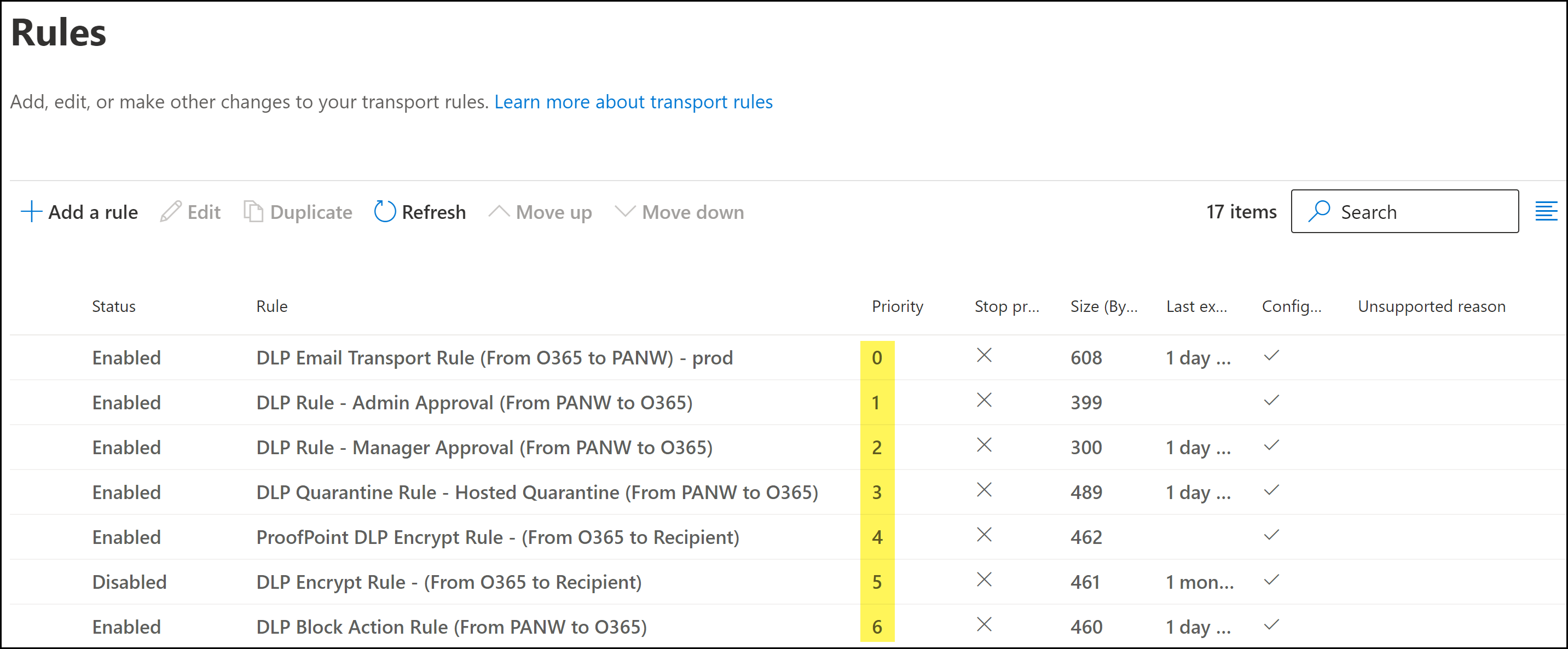 - There is no impact in regards to priority between the quarantine transport rules, block transport rule, encrypt transport rule, or any other transport rules that exist.After Enterprise DLP inspects and returns the email back to Microsoft Exchange, the appropriate transport rule action will occur based on the email header.