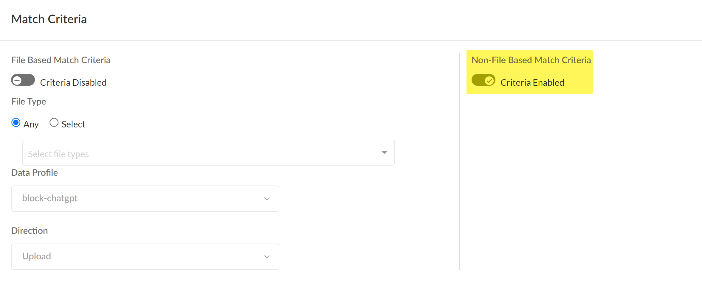 - Enable Non-File Based Match Criteria.DLP rules configured for non-file detection are required to prevent exfiltration of sensitive data to ChatGPT. You can further modify the DLP rule to enforce your organization’s data security standards. The DLP rule has an identical name as the data profile from which it was automatically created.You can keep File Based Matched Criteria enabled or disable as needed. Enabling this setting has no impact on detection of egress traffic to ChatGPT as long as Non-File Based Match Criteria is enabled.