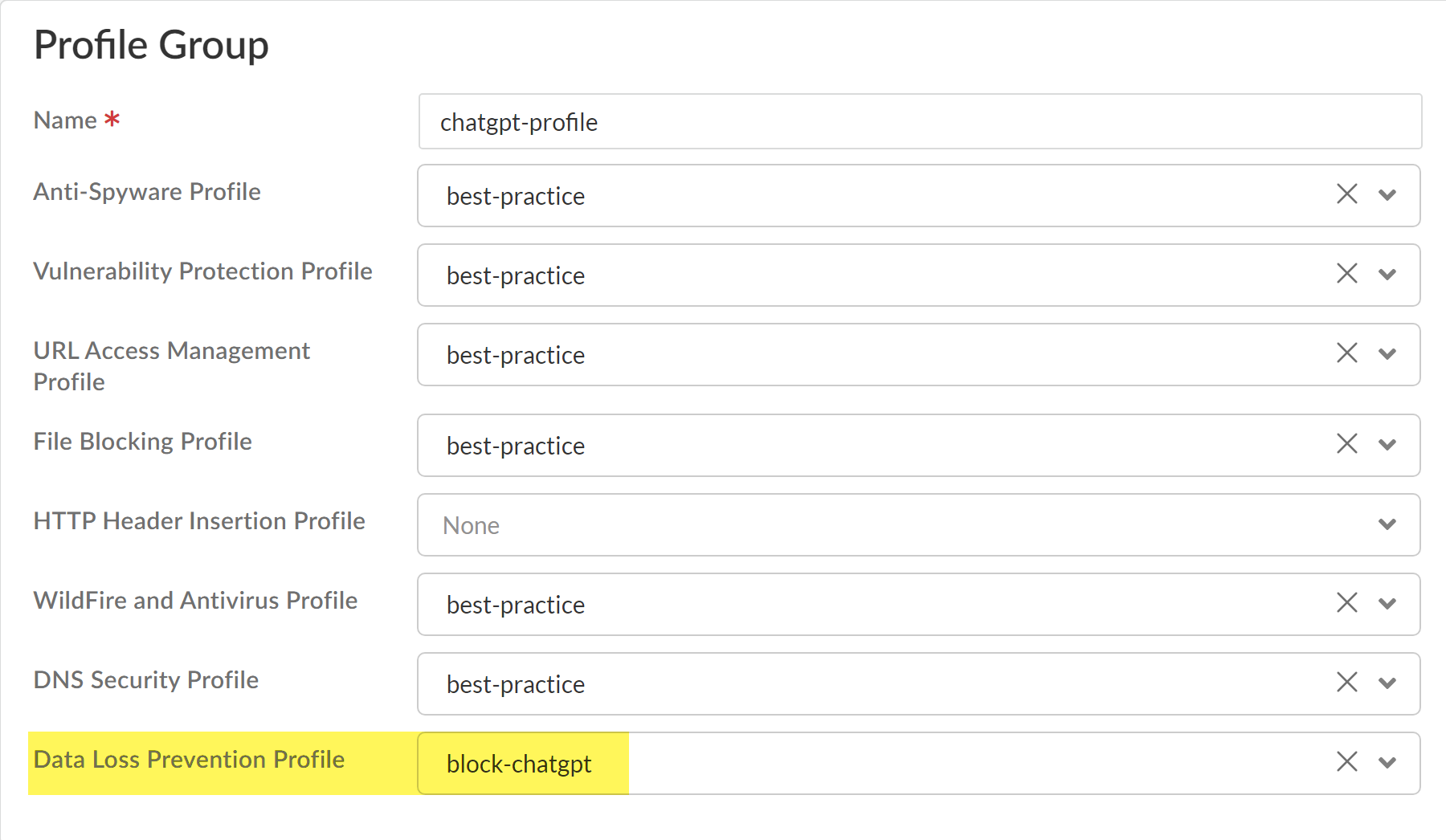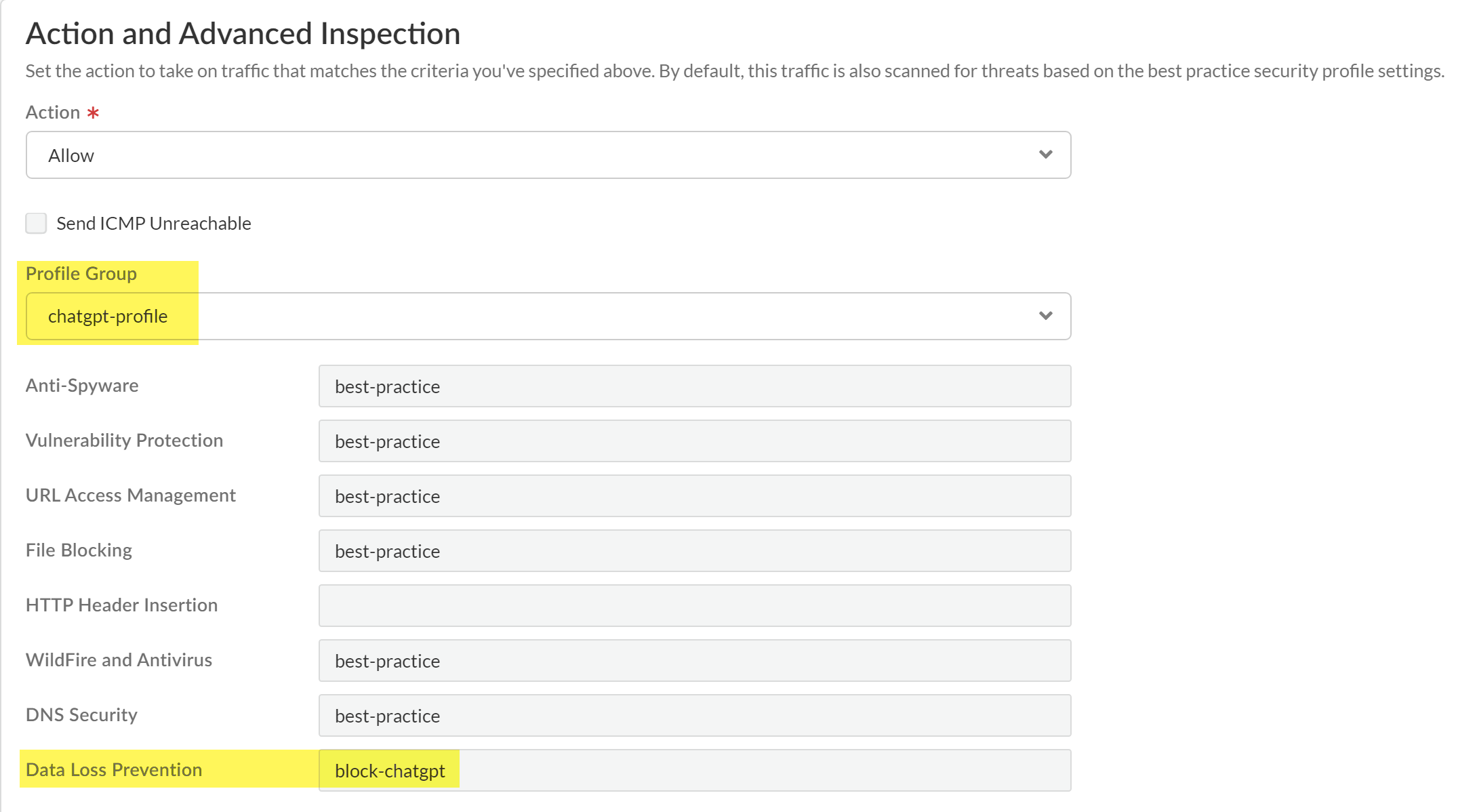 Enable Non-File Inspection.Data filtering profiles configured for non-file detection are required to prevent exfiltration of sensitive data to ChatGPT. You can create a new data filtering profile or use existing data filtering profiles as needed. You can add any combination of custom or predefined data patterns to define the match criteria.Create a data profile on Panorama or Strata Cloud Manager, or use an existing data profile.Attach the data filtering profile to a Security policy rule.- Select PoliciesSecurity.You can select an existing Security policy rule or Add a new Security policy rule.Configure the General and Source as needed.Configure the Destination as needed.For the Application, Add and search for openai-chatgpt.Skip this step if your Security policy rule applies to Any application. ChatGPT is automatically included for a Security policy rule that applies to Any application.Select Actions and configure the Profile Settings.Select Profiles and select the Data Filtering profile you created in the previous step.If the data filtering profile is part of a Security Profile Group (ObjectsSecurity Profile Groups), select Group and select the Security Profile Group the data filtering profile is associated with.Configure the rest of the Security policy rule as needed.The Action you specify in the data filtering profile determines whether egress traffic to ChatGPT is blocked. The Security policy rule Action does not impact whether matched traffic is blocked.For example, if you configured the data filtering profile to Block matching egress traffic but configure the Security policy rule Action to Allow, the matching egress traffic to ChatGPT will be blocked.Click OK.Commit and push the new configuration to your managed firewalls to complete the Enterprise DLP plugin installation.This step is required for Enterprise DLP data filtering profile names to appear in Data Filtering logs.The Commit and Push command isn’t recommended for Enterprise DLP configuration changes. Using the Commit and Push command requires the additional and unnecessary overheard of manually selecting the impacted templates and managed firewalls in the Push Scope Selection.