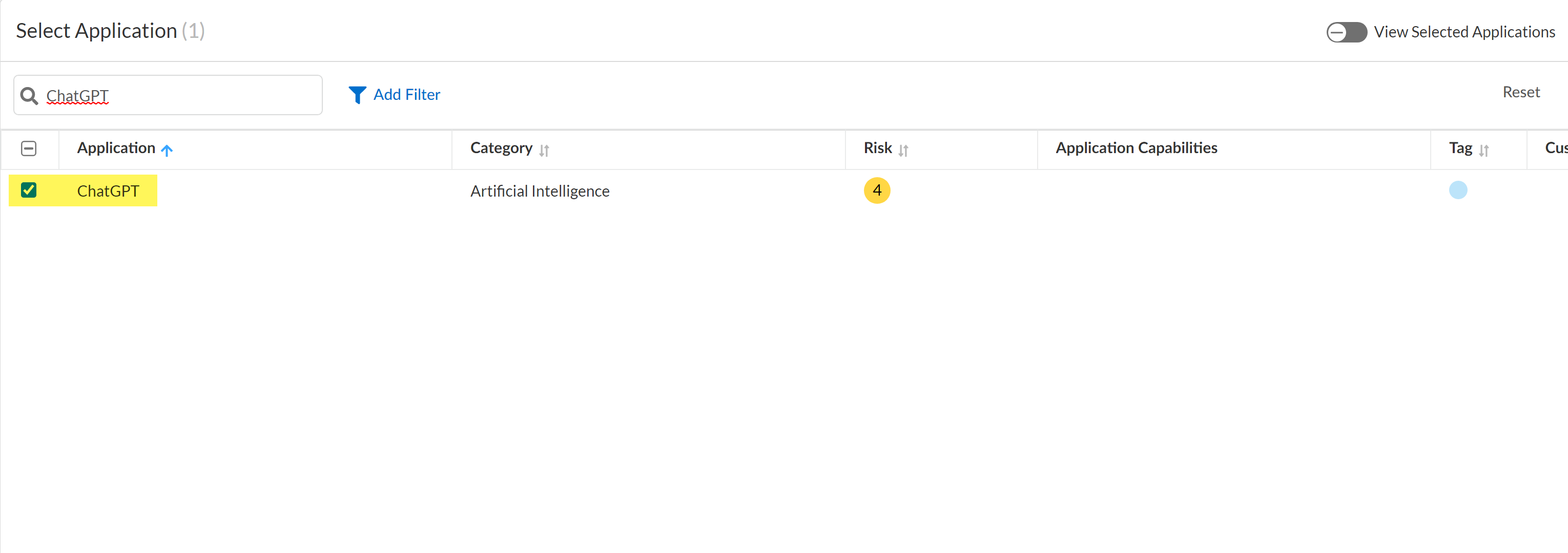 Create a Security policy and attach the Profile Group.Alternatively, you can create or add ChatGPT to an Internet Access policy rule. You can skip this step if you create a Internet Access policy rule for ChatGPT.- Select ConfigurationSecurity ServicesSecurity Policy and Add Rule.You can also update an existing Security policy to attach a Profile Group for Enterprise DLP filtering.In the Applications, Services, and URLs section, Add Applications to search for and select openai-chatgpt.