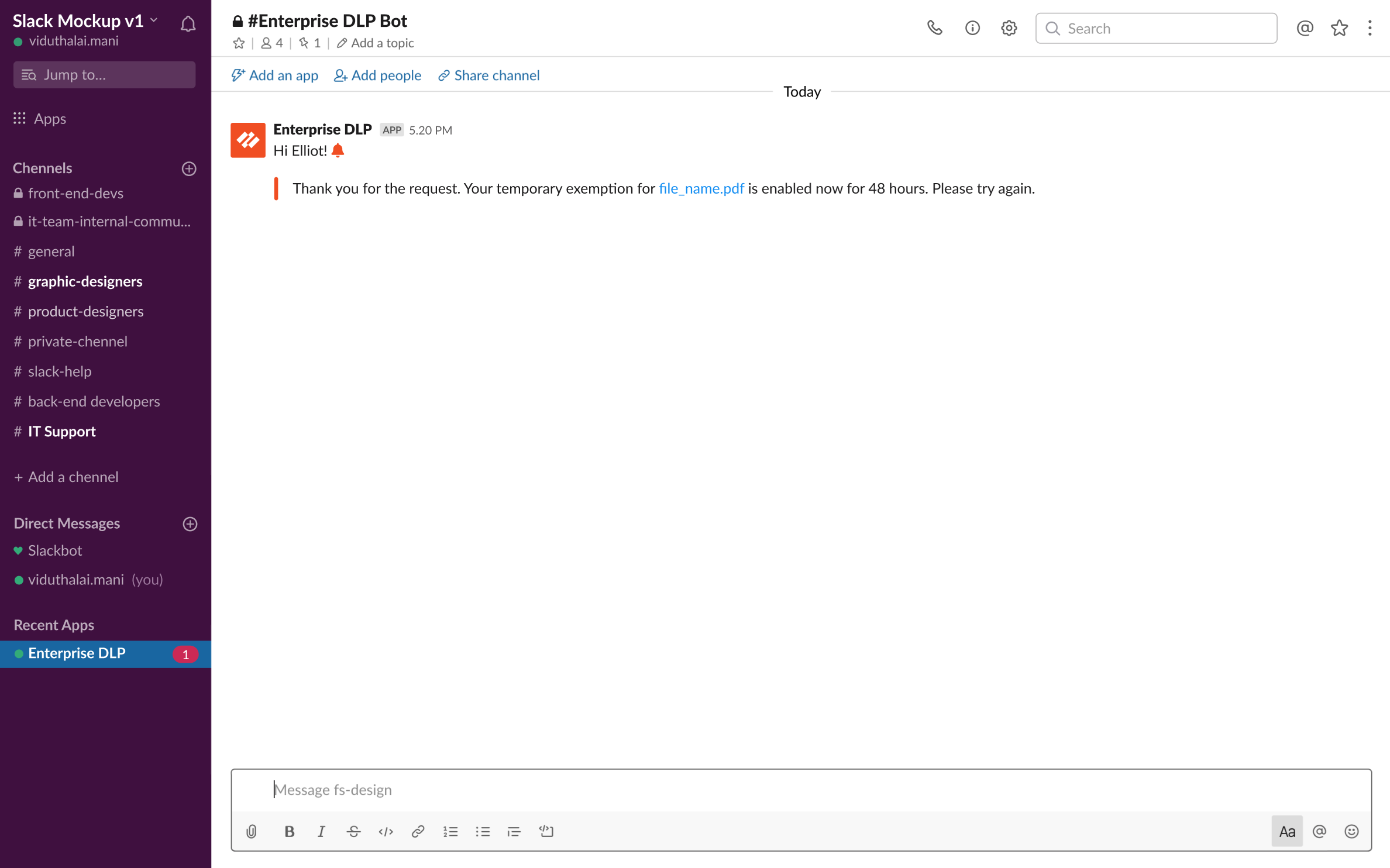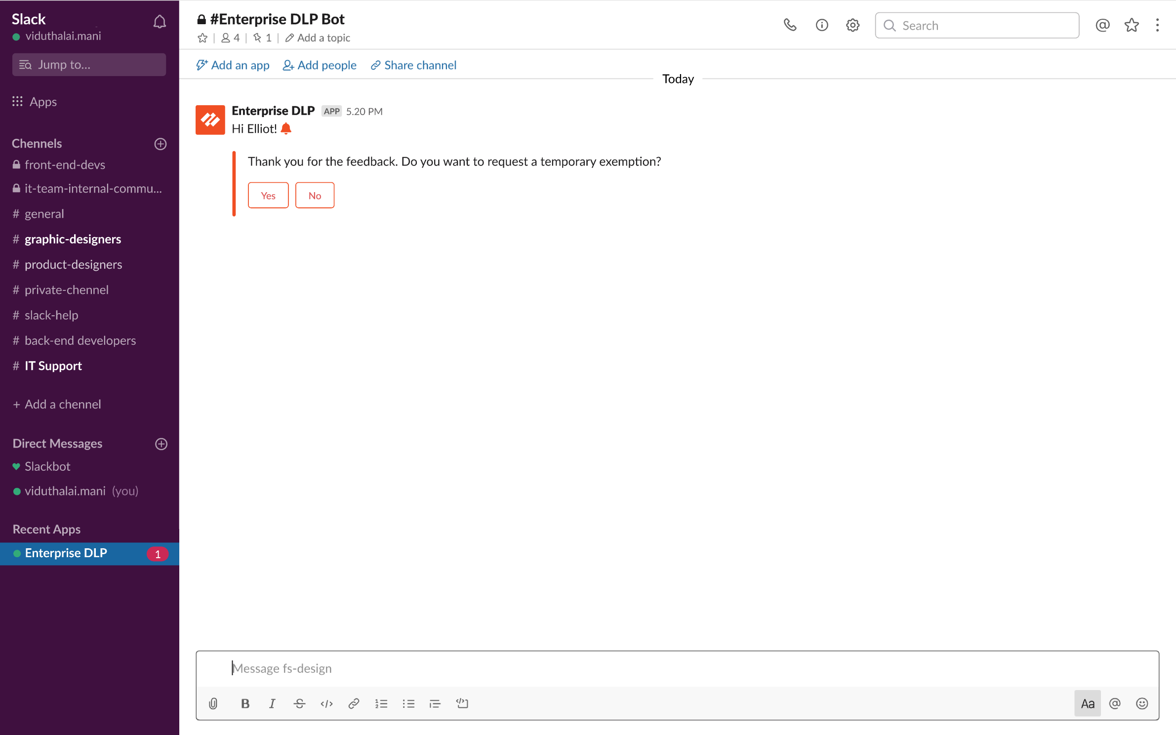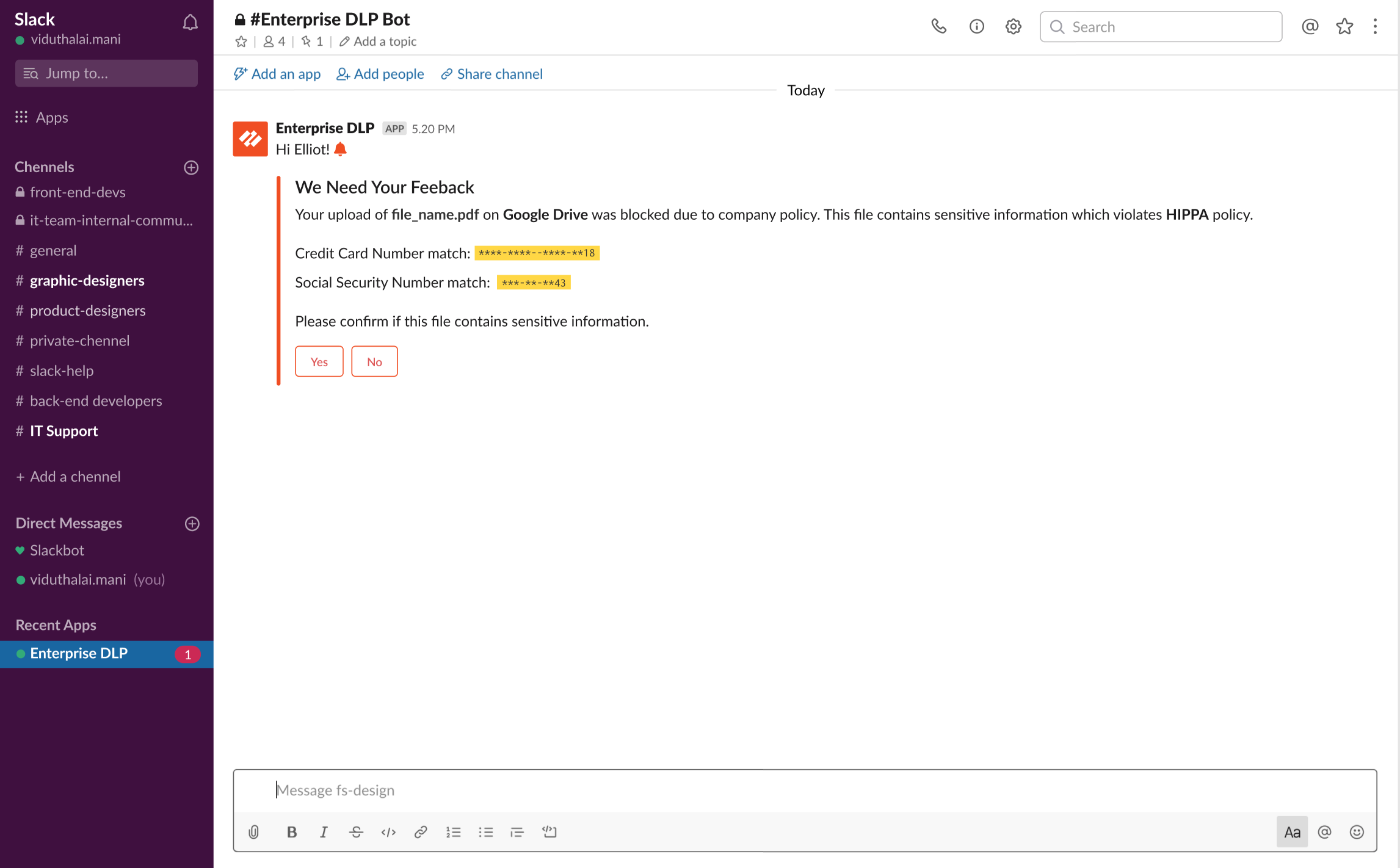 - Upload a file containing sensitive data that matches a data profile.On Slack, the Enterprise DLP Bot sends an automated message to the team member who uploaded the file containing sensitive data.Select Yes to confirm that the uploaded file containing sensitive data and to request an exemption.Select No to confirm that the uploaded files doesn’t contain sensitive data and flag the file as a false positive. If you select No, the file remains as blocked for any future upload of the same file. You will receive confirmation for the Enterprise DLP Bot that your response was successfully received.