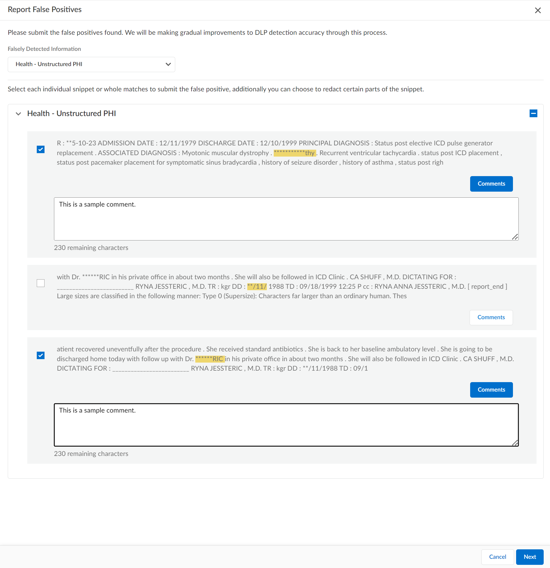 - Log in to Strata Cloud Manager.Reviewed your data patterns, profiles, and Security policy rules to reduce false positive detections.Select ConfigurationData Loss PreventionDLP Incidents.In the Incidents, click the File name of the false positive DLP incident you want to report to Palo Alto Networks.In the Matches within Data Profile window, click Report False Positive.In the Falsely Detection Information, select one or more data patterns.Enterprise DLP displays the list of available data patterns based on the data profile that generated a false positive detection. Enterprise DLP only displays data patterns associated with the data profile.Select one or more snippets of false positive detections.You can select snippets from multiple data patterns associated with the data profile if selected.(Optional) Add a Comment to provide additional details to Palo Alto Networks.This helps Palo Alto Networks understand how to improve the predefined data pattern match criteria or how to train the ML models to improve detection accuracy.Click Next.