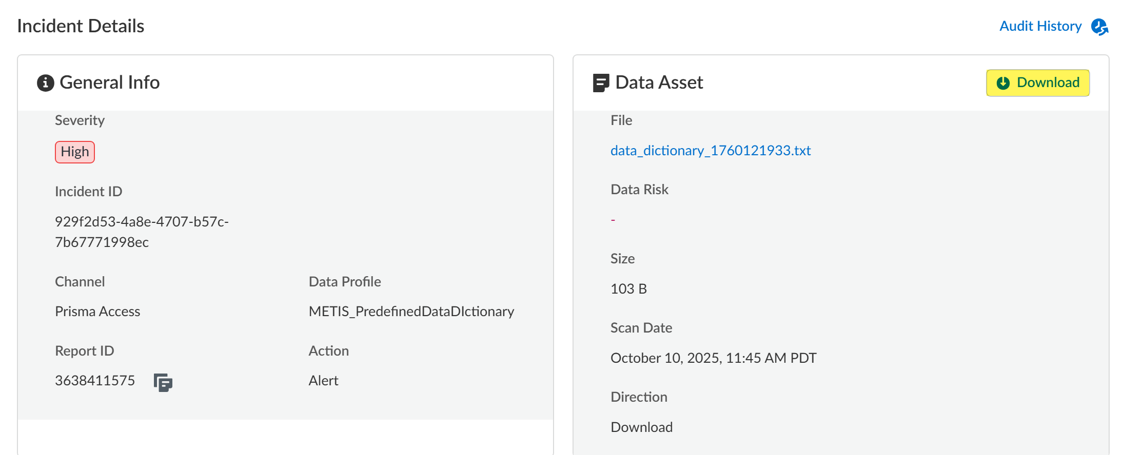 - Connect your AWS storage bucket, Azure storage bucket, or SFTP server to Enterprise DLP if not already connected.The files available to download are only files scanned by Enterprise DLP after you successfully connected Enterprise DLP to your storage bucket.(AWS and Azure only) Log in to the Amazon AWS console or Microsoft Azure portal and access the cloud storage you connected to Strata Cloud Manager. Select Reports and enter a Report ID to Search.The object Name is the Report ID.Log in to Strata Cloud Manager.Select ConfigurationData Loss PreventionDLP Incidents and search for the Report ID.Review report summary and click the download button to download the file to your device.Whether the stored file is downloaded directly to your local device is dependent on the storage bucket you connected to Enterprise DLP.