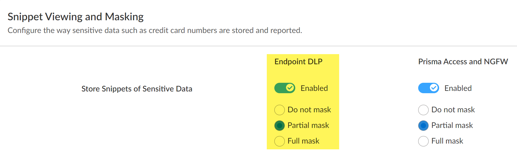 - Log in to Strata Cloud Manager.Select ConfigurationData Loss PreventionSettingsSensitive Data.Enable Snippets Viewing and Masking for Prisma Access and NGFW to store the snippets of sensitive data that match your Enterprise DLP data patterns.Configure how to Snippets Masking for storage in the DLP cloud service.