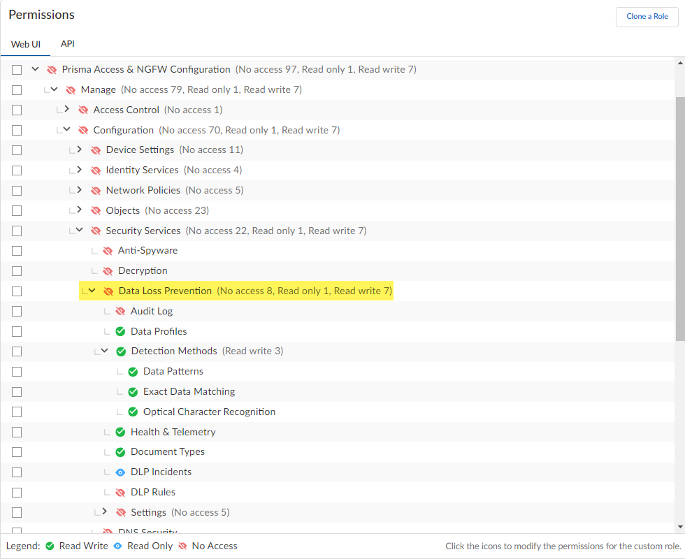 - Log in to Strata Cloud Manager.Use one of the various ways to access Identity & Access.Add Access to your tenant where Enterprise DLP is active.This step is required only if the user for which you’re granting Enterprise DLP access isn’t already registered with the Palo Alto Networks Customer Support Portal (CSP).Select Prisma Access & NGFW ConfigurationManageConfigurationSecurity ServicesData Loss Prevention and configure the custom role.You can use custom roles allow to define which permissions are enforced for your users and allow more granular access control to Enterprise DLP than predefined roles.The access permissions applied to the Data Loss Prevention parent node determines the lowest access privilege you can assign to any of its child nodes. For example, if you want to provide No Access and Read Only to some areas of Enterprise DLP, you must first assign No Access to the Enterprise DLP application.Below is an example of a custom Enterprise DLP role. The custom role is configured with no access privileges to Audit Logs or any of the Enterprise DLP settings. However, read-only access is configured for the Health & Telemetry and DLP Incidents, and full read and write privileges are configured for Data Profiles, all Detection Methods, Document Types, and DLP Rules.