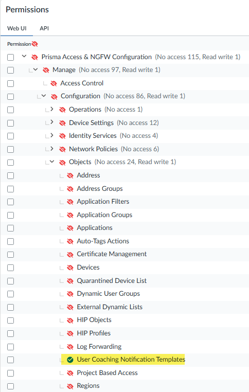 Configure access privileges to allow a data security administrator to create End User Coaching notification templates.End User Coaching enables Enterprise DLP to display notifications to your end users when they generate an Enterprise DLP or Endpoint DLP incident. The end user notification template defines which DLP rules generate a notification and the contents of the notification.Select Prisma Access & NGFW ConfigurationManageObjects and configure the access privileges for User Coaching Notification Templates.