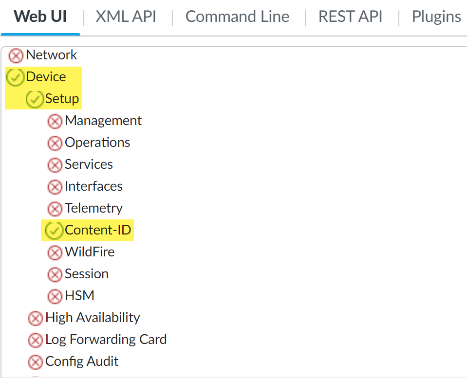 - DeviceSetup—To grant read and write access to the Enterprise DLP data filtering and Cloud Content settings, you must enable read and write access to the Content-ID tab and disable access for the remaining settings.