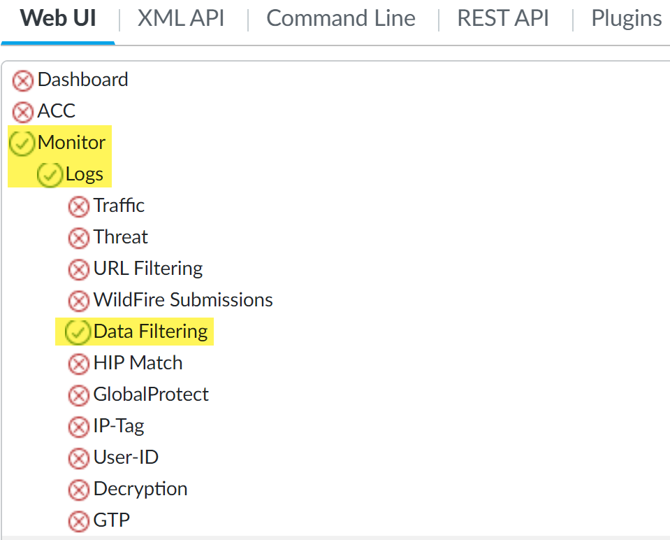- MonitorLogsData Filtering—Access privileges to data filtering logs. You must Enable or give Read Only access to data filtering logs to allow the administrator to view DLP incidents.
