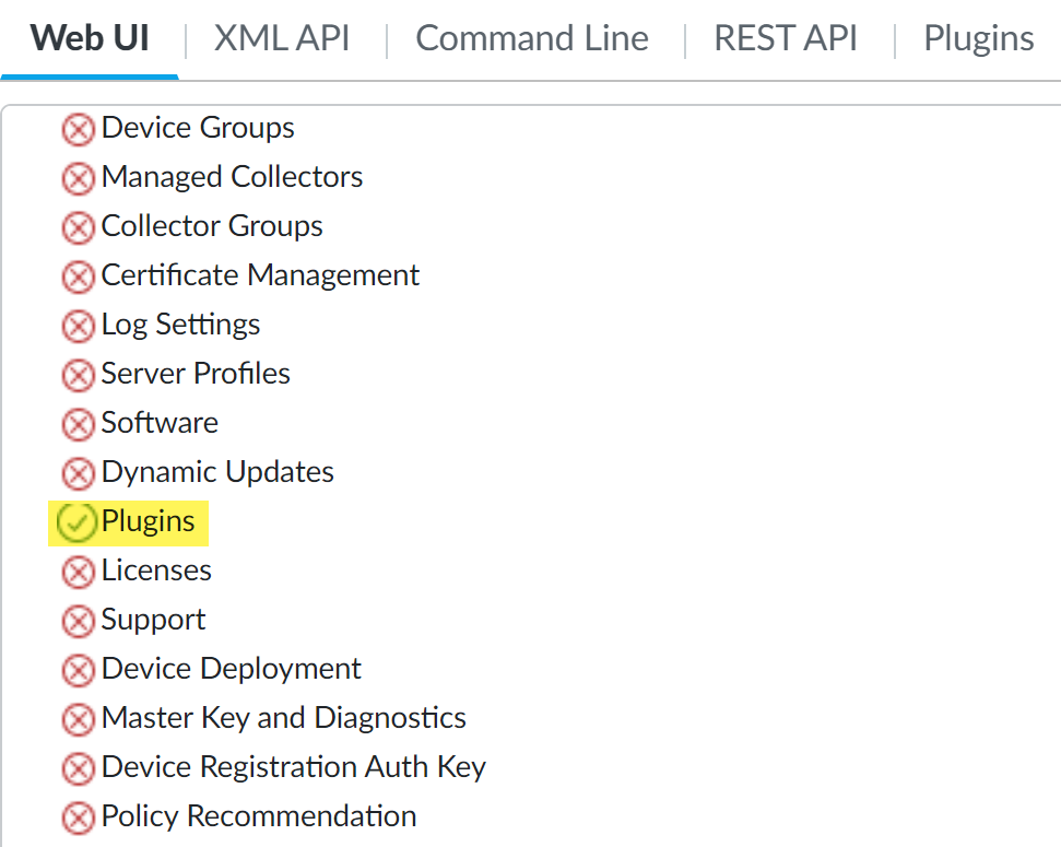 - PanoramaPlugins—Access privileges to upgrade the Enterprise DLP plugin on Panorama and read and write access to the Enterprise DLP snippets settings.If you have other Panorama plugins installed, this will enable access to those configuration nodes in the Panorama tab as well.