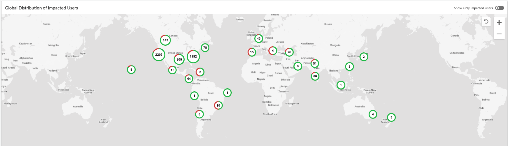 The map in this widget shows you how many Zoom users are connected in each Prisma Access Location. The circle representing each location is color coded to give you an overview of the average of all users' experience in that Location. The map makes it quick to identify regional issues like ISP outages. Hover over a circle to see the number of Mobile Users connected in the geographic location separated by their experience scores. Clicking on the number of users takes you to the Monitored Mobile Users page where the Monitored Mobile User Devices table displays the details for each user in that location.