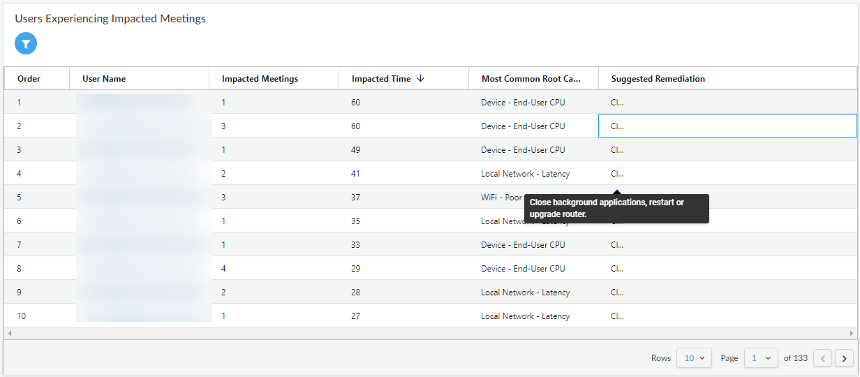 View a list of all the users who were impacted by any Zoom meeting that they attended throughout the organization. Click a User Name to go to the user's User Details page. You can filter the data in this table by selecting a filter from