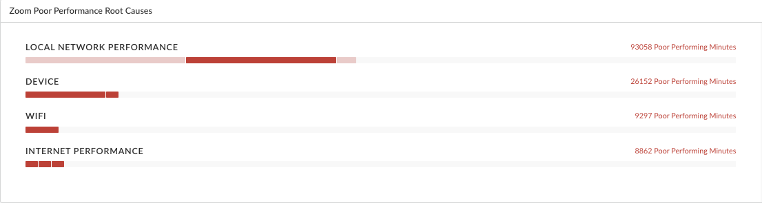 This widget breaks down and categorizes the root cause of poor performance. The reason for poor call performance can lie in any segment such as the user's device, the local network the device is connected to, internet performance, or the WiFi. Here, you can see every minute of poor call performance graphed by the most likely root-cause and broken down by service delivery segment. Hover over a root cause in any segment as shown below to see more details about it.