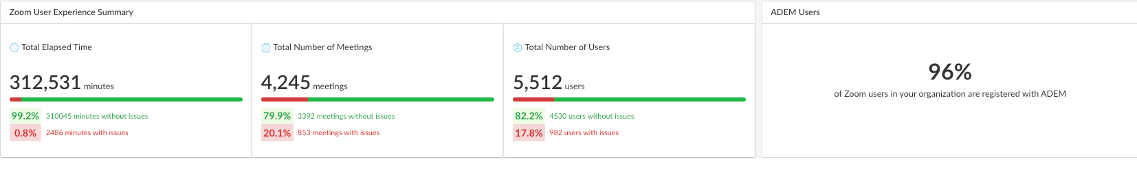 This widget displays the aggregate Zoom app experience for all users across the organization. It gives you a bird's eye view of the total number of Zoom meetings attended by all users in the organization during the Time Range and the sum of all the meetings' duration in minutes along with the percentage of meetings/minutes that did not have any issues. It tells you what percentage of users who used Zoom were also registered with ADEM.