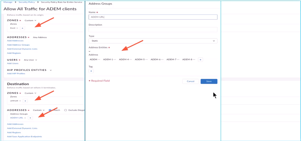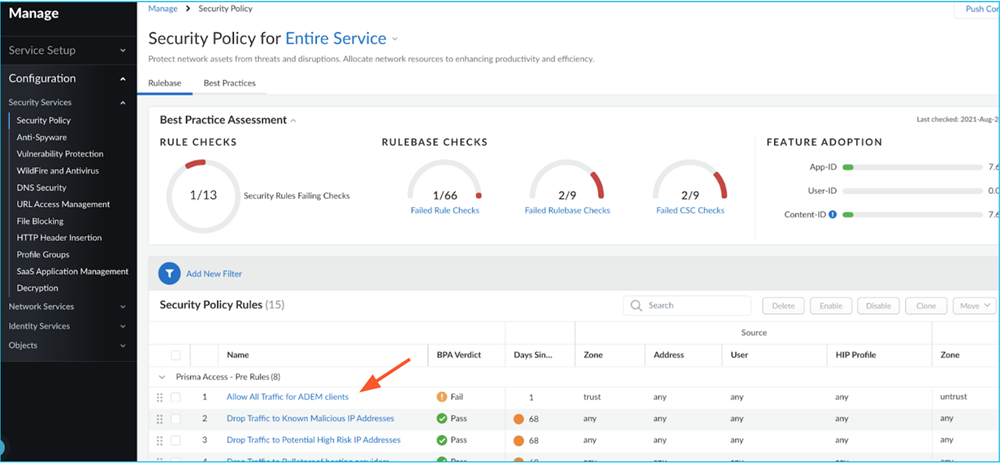 3. Make sure you have security policy rules required to allow the GlobalProtect app to connect to the ADEM service and run the synthetic tests.