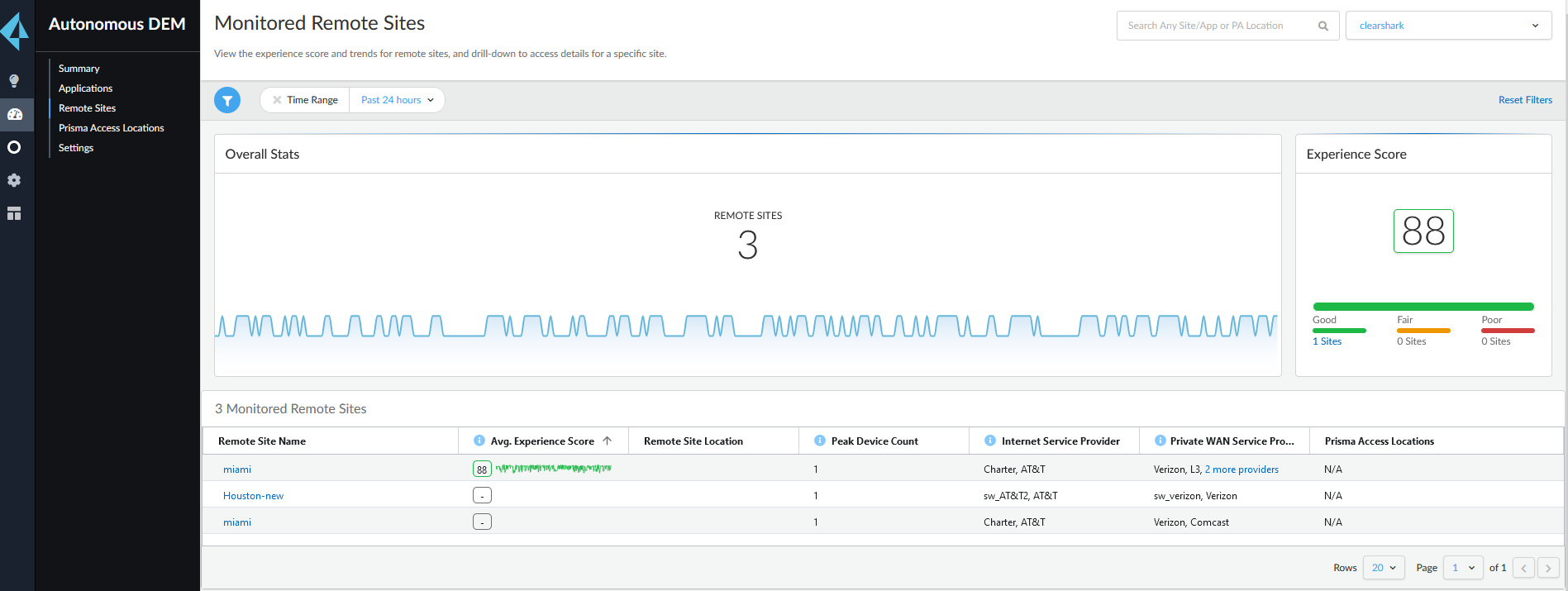 Site Experience card. The Remote Sites dashboard