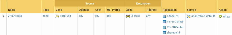 Click OK to save the interface configuration.If you created a separate zone for tunnel termination of VPN connections, create a security policy to enable traffic flow between the VPN zone and your trust zone.For example, the following policy rule enables traffic between the corp-vpn zone and the l3-trust zone.