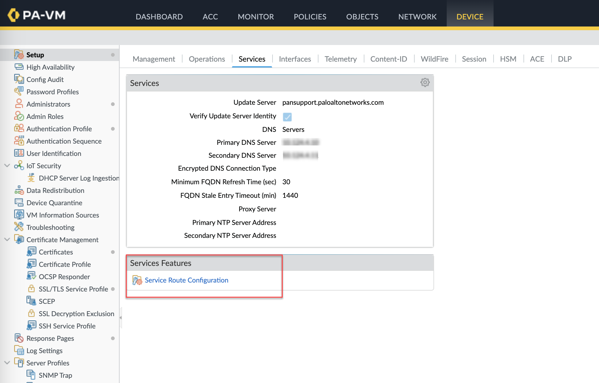 You can configure your customized dataplane as a service route for sending DHCP requests, if you do not want to use the default management interface for sending DHCP requests.Use the following procedure to configure a service route for DHCP requests:- Go to DeviceSetupServices.