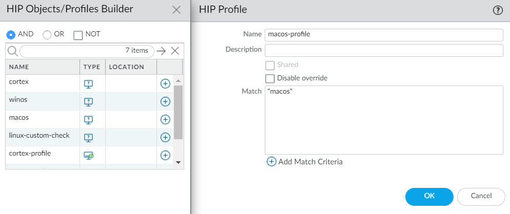 Click OK to save the HIP object. You can Commit the changes to view the data in the HIP Match logs at the next device check-in or continue to step 6.(Optional) Create a HIP profile to allow the HIP object to be evaluated against traffic.The HIP profile can be added to a security policy as an additional check for traffic matching that policy. When the traffic is matched to the HIP profile, the security policy rule is enforced on the traffic.For more details on creating a HIP profiles, see Configure HIP-Based Policy Enforcement.- Select ObjectsGlobalProtectHIP Profiles.Select an existing HIP profile or Add a new one.Click Add Match Criteria to open the HIP Objects/Profile Builder.Select the HIP object that you want to use as match criteria, and then click the add () icon to move it to the Match area of the HIP Profile.