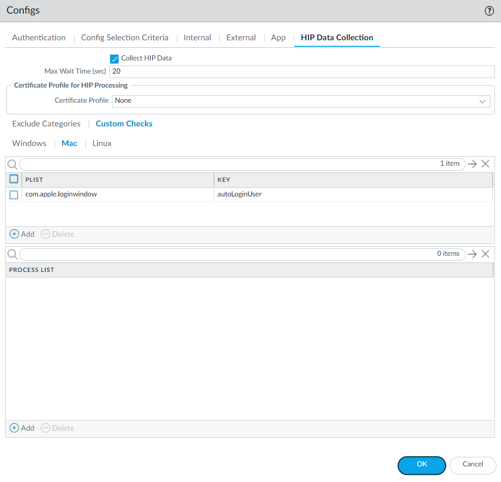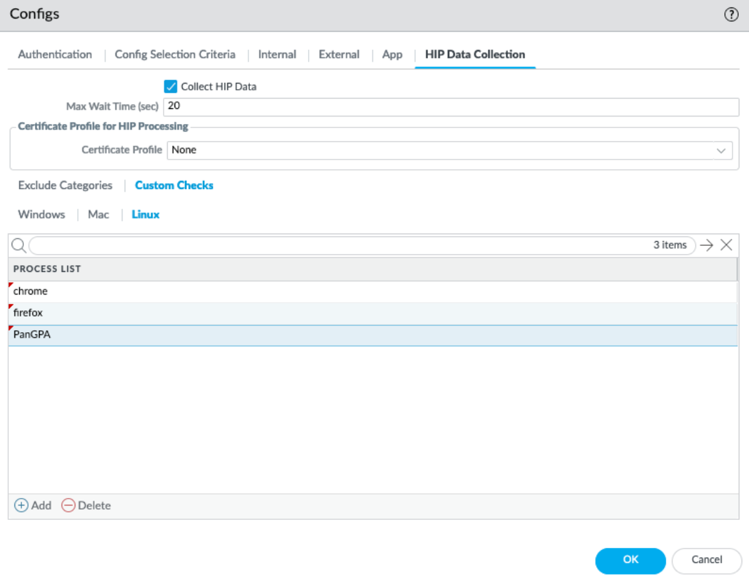 (Optional) Check if a specific process is running on the endpoint.- Select NetworkGlobalProtectPortals.Select an existing portal configuration or Add a new one.On the Agent tab, select the agent configuration that you want to modify or Add a new one.Select HIP Data Collection.Enable the GlobalProtect app to Collect HIP DataSelect Custom ChecksWindows, Mac, or Linux.Add the name of the process that you want to collect information about to the Process List.Save the custom check.Click OK and Commit the changes.(Optional) Create a HIP Object to match to a Registry Key (Windows), plist (macOS), or process list (Linux), which allows you to filter the raw host information collected from the GlobalProtect app to monitor the data for the custom check.With a HIP object defined for the custom check data, the gateway matches the raw data submitted from the app to the HIP object, and a HIP Match log entry is generated for the data (MonitorHIP Match).For Windows, macOS, and Linux endpoints: