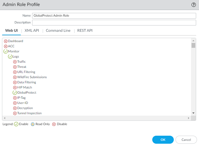3. Select Monitor, Logs, and GlobalProtect to enable, disable, or provide read-only access to the GlobalProtect logs.