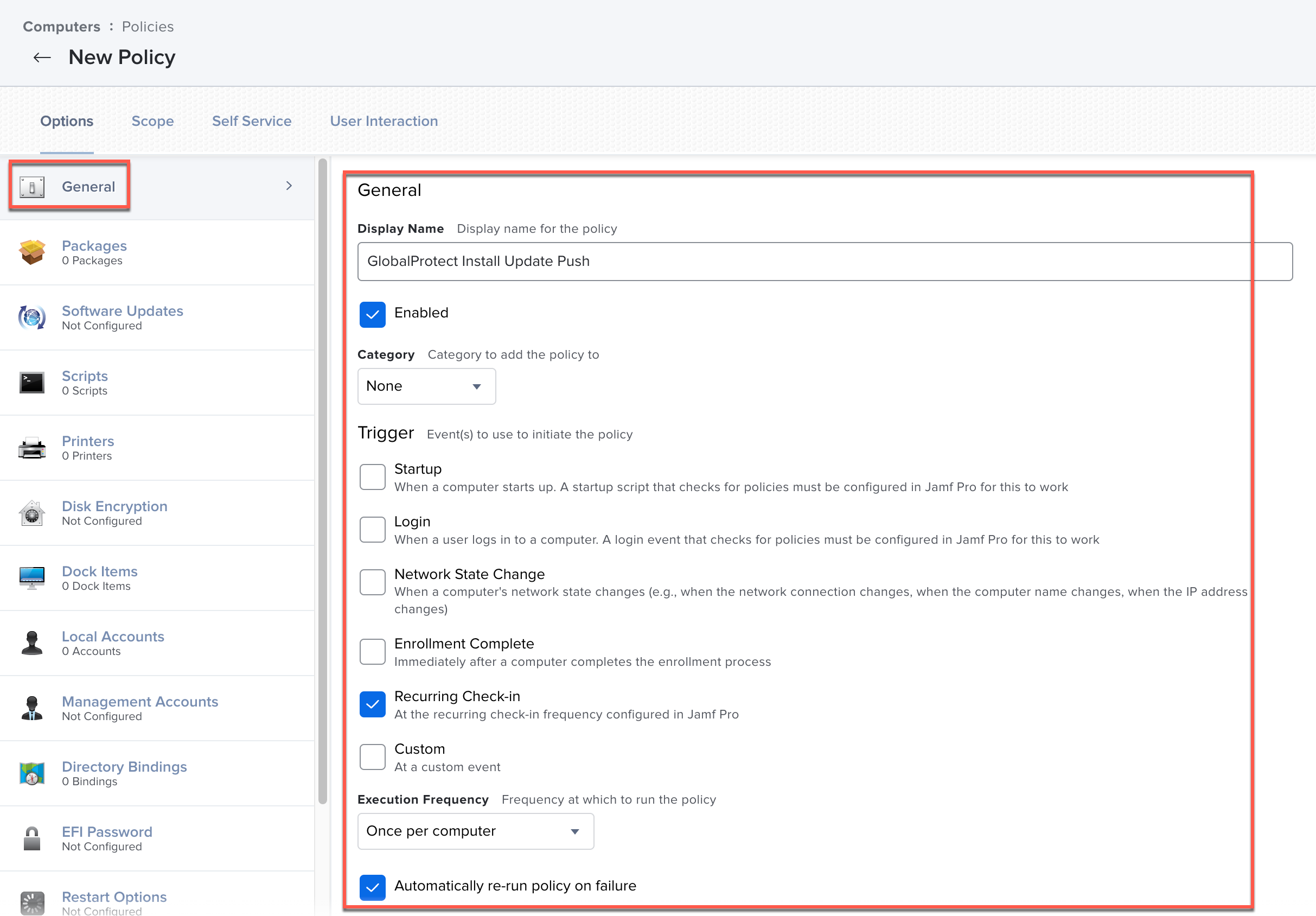 Save the policy.The next time macOS endpoints in the Smart Computer Group that is scoped to the policy check in with Jamf Pro and meet the trigger in the General payload, the policy will run and deploy the GlobalProtect app to the endpoints.