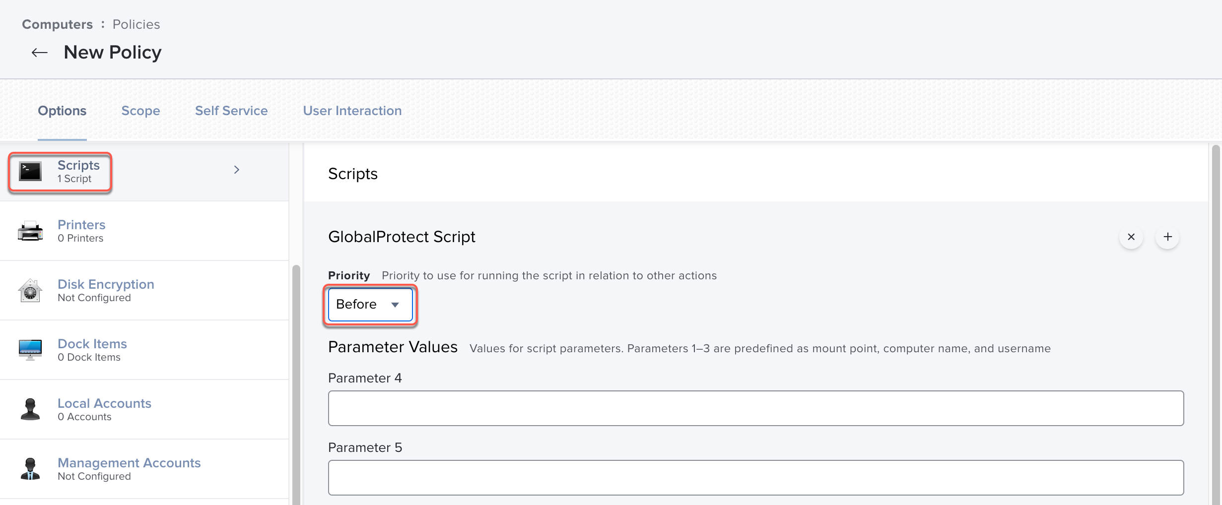 For example, the following sample script pushes the default GlobalProtect portal address, connection method, and the setting for using the default system browser for SAML authentication:#!/bin/bash ## Description: Checks for global preferences file and populates ## it with the default portal if needed. ## Body ########################################################### ## Declare Variables ############################################## # Get current Console user active_user=$( stat -f "%Su" /dev/console ) # Global Prefs File gPrefs=/Library/Preferences/com.paloaltonetworks.GlobalProtect.settings.plist ## Logic ########################################################## # Check to see if the global preference file already exists... if [[ -e $gPrefs ]]; then echo "Default global portal already exists. Skipping." else echo "Setting default global portal to: your.portal.here.com" echo "Setting fips mode" # If it does not already exist, create it and populate the default portal using the echo command echo '<?xml version="1.0" encoding="UTF-8"?> <!DOCTYPE plist PUBLIC "-//Apple//DTD PLIST 1.0//EN" "http://www.apple.com/DTDs/PropertyList-1.0.dtd"> <plist version="1.0"> <dict> <key>Palo Alto Networks</key> <dict> <key>GlobalProtect</key> <dict> <key>PanSetup</key> <dict> <key>Portal</key> <string>your.portal.here.com</string> <key>Prelogon</key> <string>0</string> </dict> <key>Settings</key> <dict> <key>connect-method</key> <string>on-demand</string> <key>default-browser</key> <string>yes</string> </dict> </dict> </dict> </dict> </plist> ' > $gPrefs echo $? # Kill the Preference caching daemon to prevent it from overwriting any changes killall cfprefsd echo $? fi # Check exit code. exit $?Add the script to Jamf Pro.- Select SettingsComputer ManagementScripts.