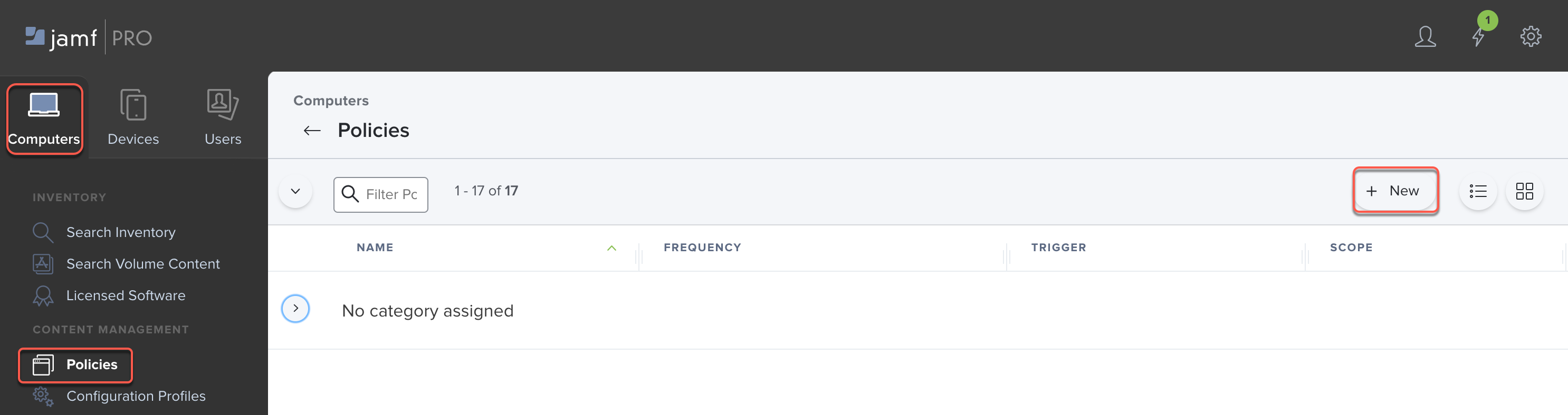 The script will be run with superuser authority.Save the script.Create a Jamf policy for running the uninstall script.- Select ComputersPoliciesNew.