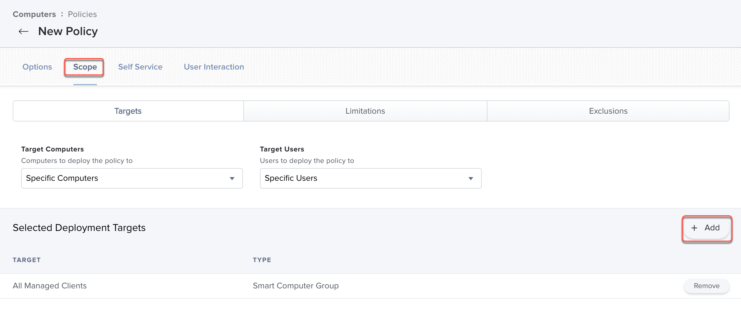 (Optional) If you created a Smart Group for your users, configure the scope of the policy to target that group.- Select Scope and Add a deployment target.