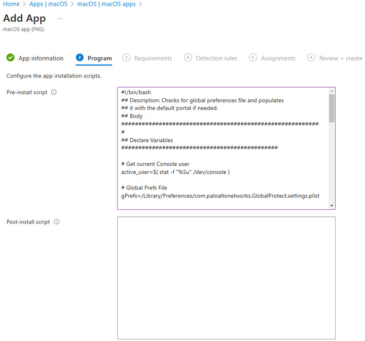In the Program tab, enter the pre-install script to be run before the GlobalProtect app is installed. With this script, you can specify the portal, connect method and whether default browser is to be used for authentication.Copy paste the following script in the Pre-install script after updating the Portal, connect-method, and default-browser values.#!/bin/bash ## Description: Checks for global preferences file and populates ## it with the default portal if needed. ## Body ########################################################### ## Declare Variables ############################################## # Get current Console user active_user=$( stat -f "%Su" /dev/console ) # Global Prefs File gPrefs=/Library/Preferences/com.paloaltonetworks.GlobalProtect.settings.plist ## Logic ########################################################## # Check to see if the global preference file already exists... if [[ -e $gPrefs ]]; then echo "Default global portal already exists. Skipping." else echo "Setting default GP portal to: {Portal FQDN here}" # If it does not already exist, create it and populate the default portal using the echo command echo '<?xml version="1.0" encoding="UTF-8"?> <!DOCTYPE plist PUBLIC "-//Apple//DTD PLIST 1.0//EN" "http://www.apple.com/DTDs/PropertyList-1.0.dtd"> <plist version="1.0"> <dict> <key>Palo Alto Networks</key> <dict> <key>GlobalProtect</key> <dict> <key>PanSetup</key> <dict> <key>Portal</key> <string>{Portal FQDN here}</string> </dict> <key>Settings</key> <dict> <key>connect-method</key> <string>on-demand | always-on</string> <key>default-browser</key> <string>{Value}</string> [yes | no] </dict> </dict> </dict> </dict> </plist> ' > $gPrefs echo $? # Kill the Preference caching daemon to prevent it from overwriting any changes killall cfprefsd echo $? fi # Check exit code. exit $?