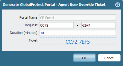 - To allow users to disable GlobalProtect only if they provide a ticket, set Allow User to Disable GlobalProtect to Allow with Ticket. With this option, the disable action triggers the app to generate a Request Number, which the end user must communicate to the administrator. The administrator then clicks Generate Ticket on the NetworkGlobalProtectPortals page and enters the request number from the user to generate the ticket. The administrator provides the ticket to the end user, who enters it into the Disable GlobalProtect dialog to disable the app.