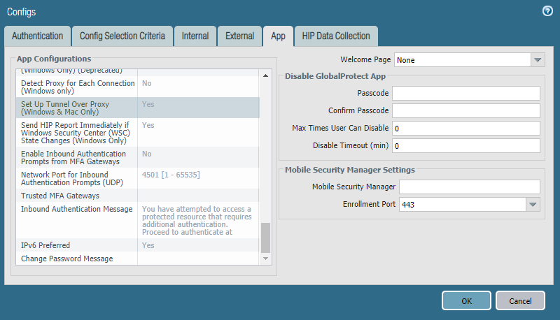 - Set Enable Inbound Authentication Prompts from MFA Gateways to Yes. To support multi-factor authentication (MFA), the GlobalProtect app must receive and acknowledge UDP prompts that are inbound from the gateway. Select Yes to enable GlobalProtect apps to receive and acknowledge the prompt. By default, the value is set to No, meaning GlobalProtect will block UDP prompts from the gateway.