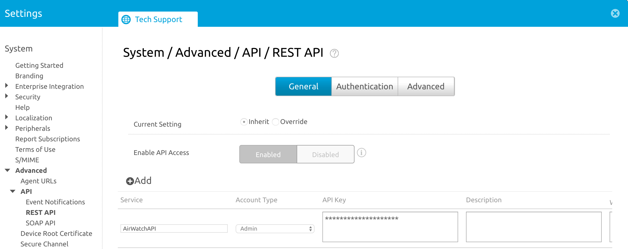 API. On the Workspace ONE console, you can find the tenant code at SystemAdvancedAPIREST APIAPI Key.
