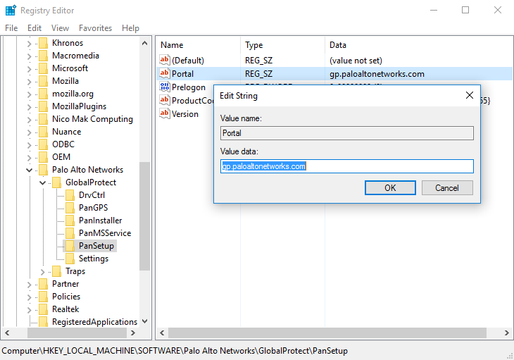 - In the Window Registry, go to:HKEY_LOCAL_MACHINE\SOFTWARE\Palo Alto Networks\GlobalProtect\PanSetupRight-click Portal and then select Modify.Enter the portal name in the Value data field, and then click OK.