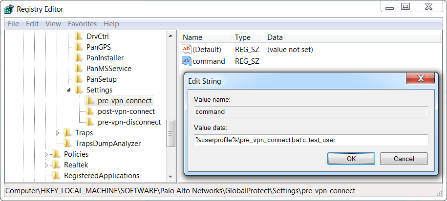 - Open the Windows registry, and locate the GlobalProtect app customization settings.Open the Windows registry (enter regedit in the command prompt) and go to one of the following key locations, depending on when you want to execute scripts (pre/post connect or pre disconnect):HKEY_LOCAL_MACHINE\SOFTWARE\Palo Alto Networks\GlobalProtect\Settings\pre-vpn-connectHKEY_LOCAL_MACHINE\SOFTWARE\Palo Alto Networks\GlobalProtect\Settings\post-vpn-connectHKEY_LOCAL_MACHINE\SOFTWARE\Palo Alto Networks\GlobalProtect\Settings\pre-vpn-disconnectIf the key does not exist within the Settings key, create it by right-clicking Settings and selecting NewKey).Enable the GlobalProtect app to run scripts by creating a new String Value named command.The batch file specified here should contain the specific script (including any parameters passed to the script) that you want run on the device.