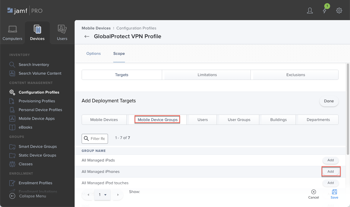 Save your settings. You can now select this configuration profile from the Per-App VPN drop-down when you add the GlobalProtect app in Jamf Pro.If you use smart or static device groups, set the scope to define the devices that will receive the configuration profile.- Click Edit if you saved your settings in the previous step.Click Scope and Add a deployment target.