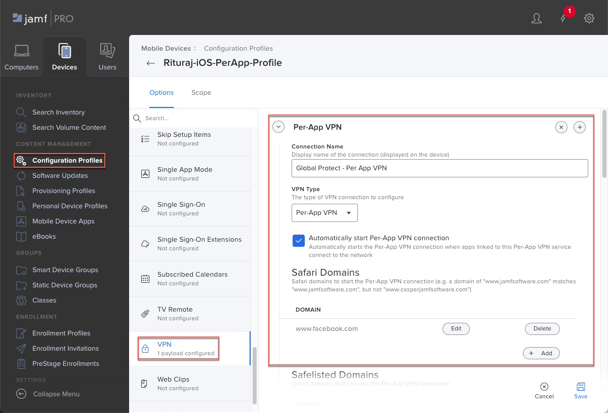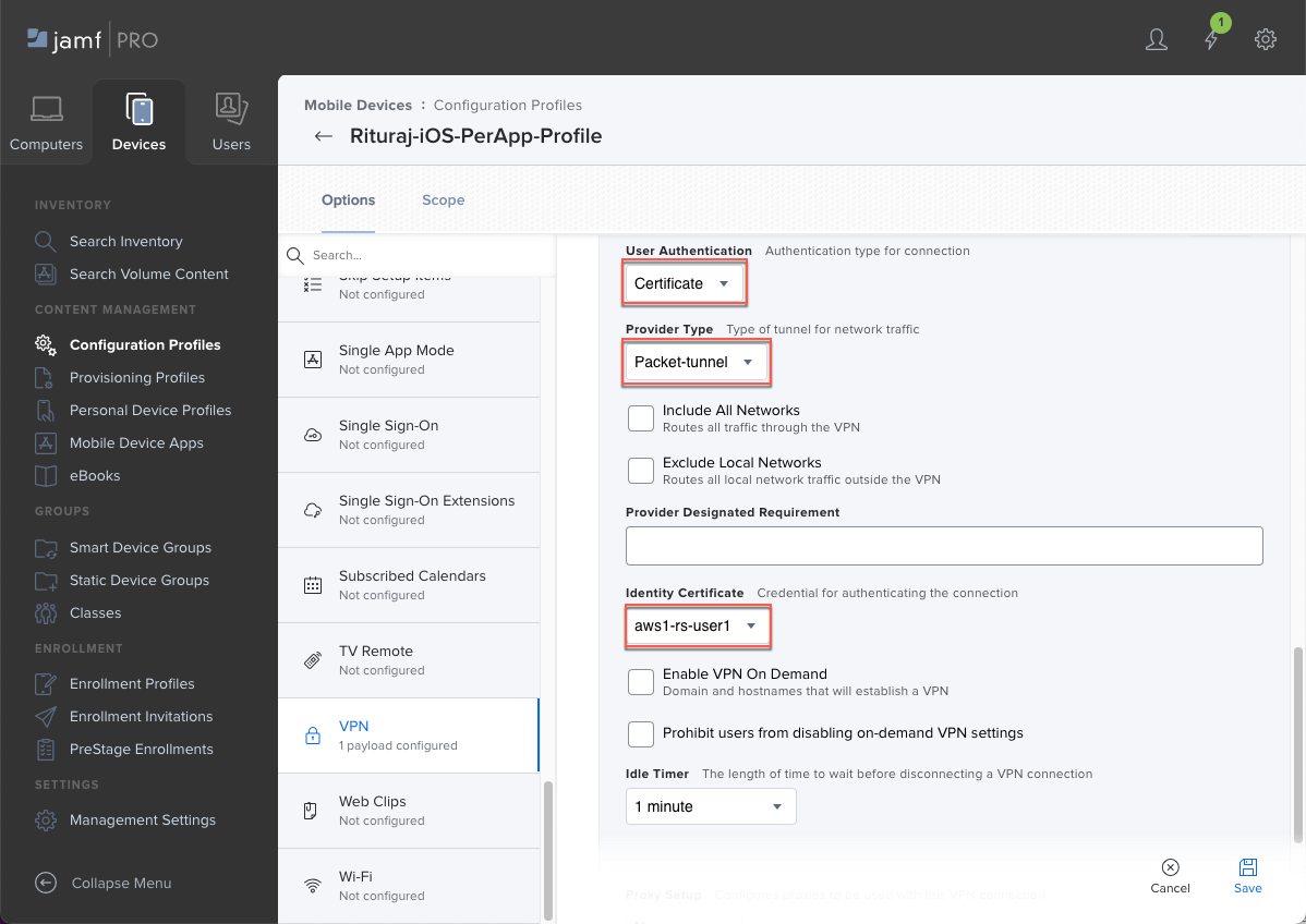 - Configure a Per-App VPN Configuration for iOS Endpoints Using Jamf Pro