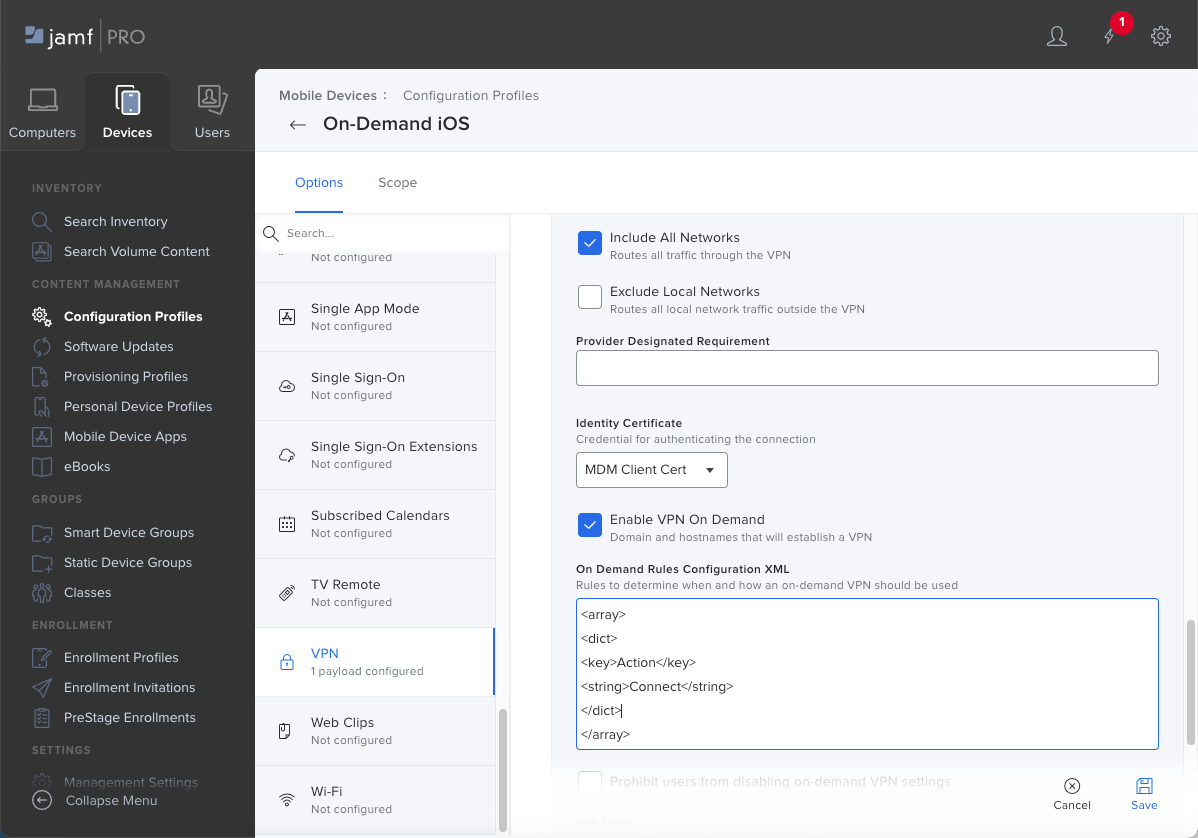 To set up an on-demand VPN configuration, use Jamf Pro to create a configuration