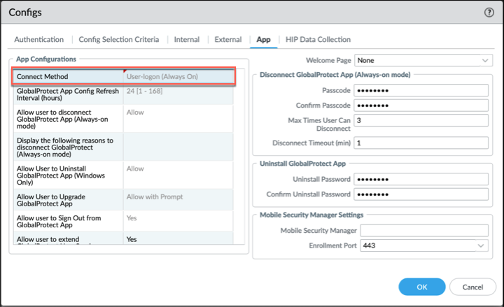 - Select NetworkGlobalProtectPortals.Select a portal configuration and select the Agent tab.Select an agent configuration and select the App tab.For the Connect Method, select User-logon (Always On).